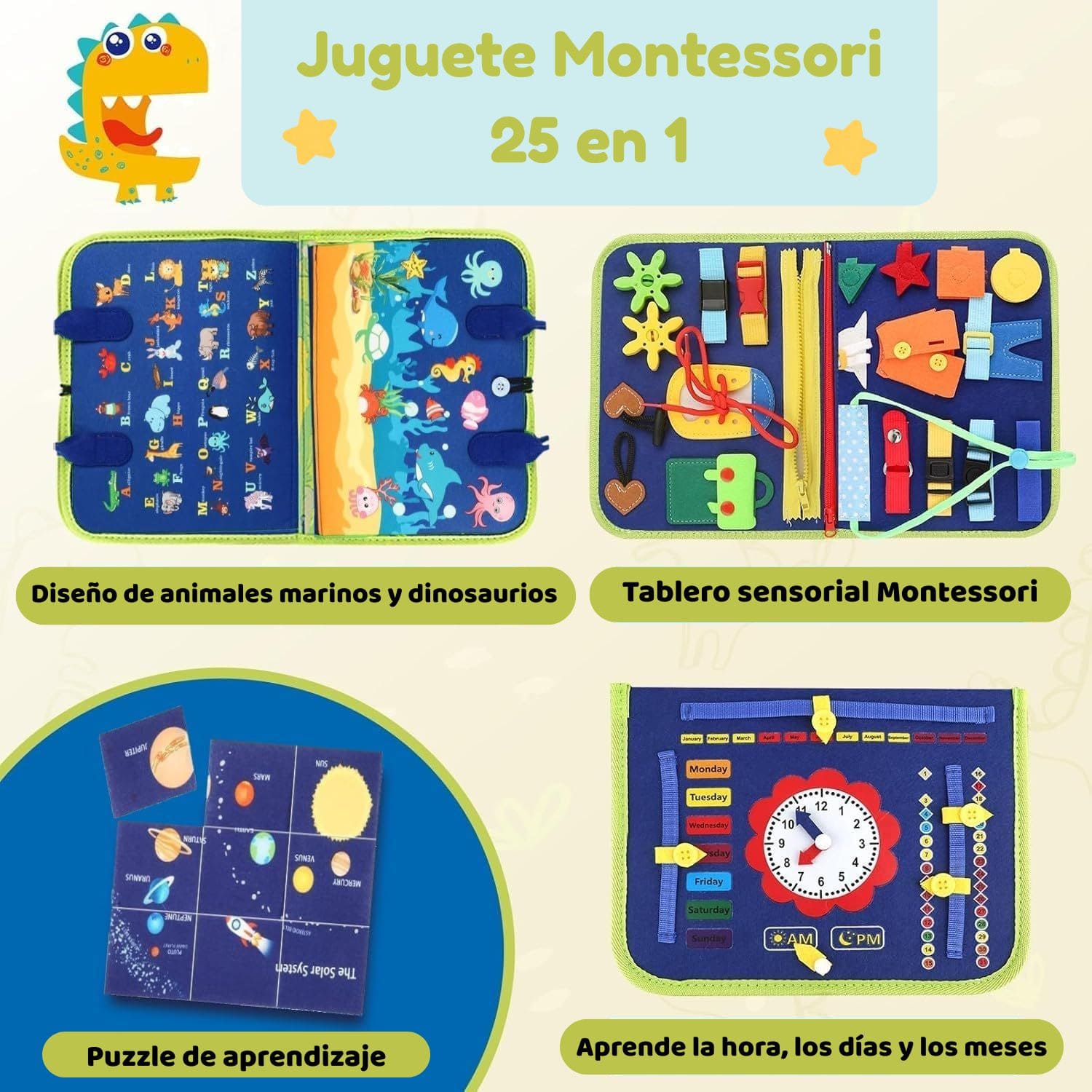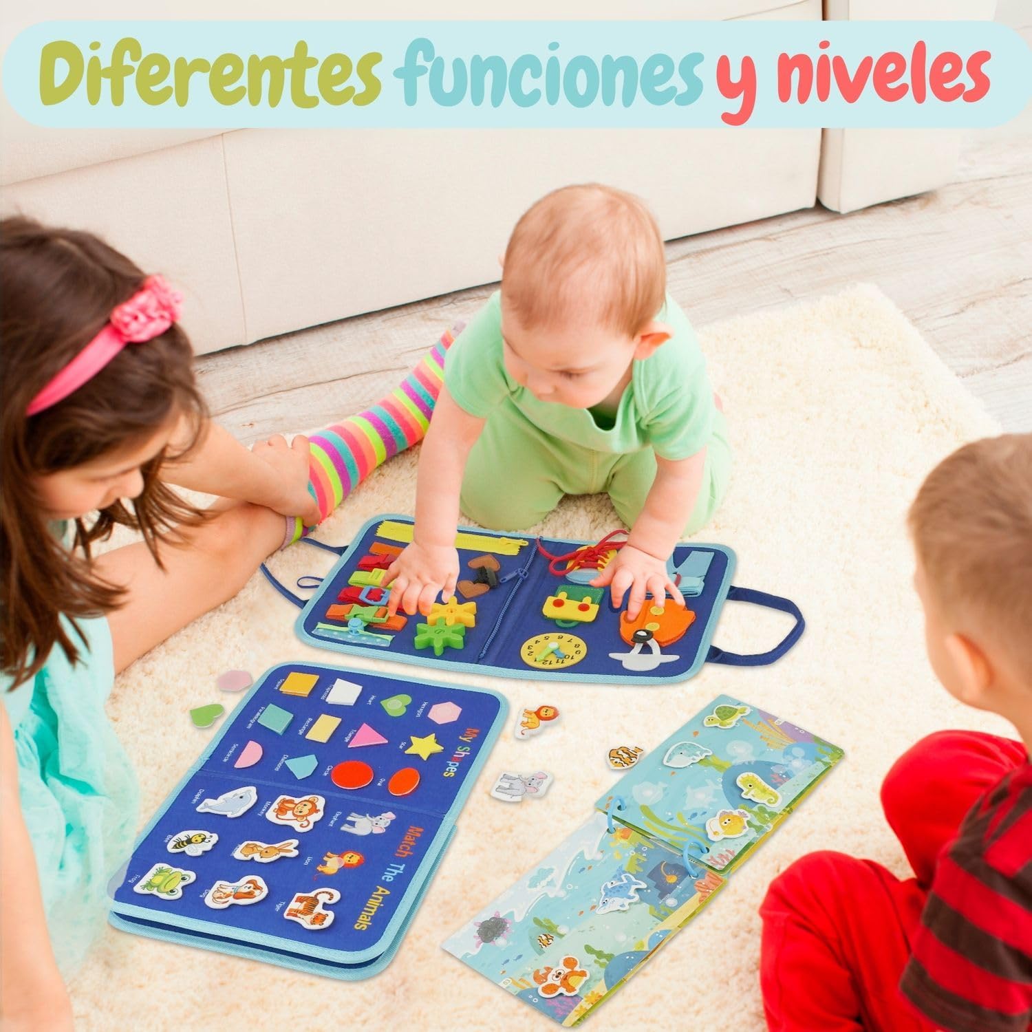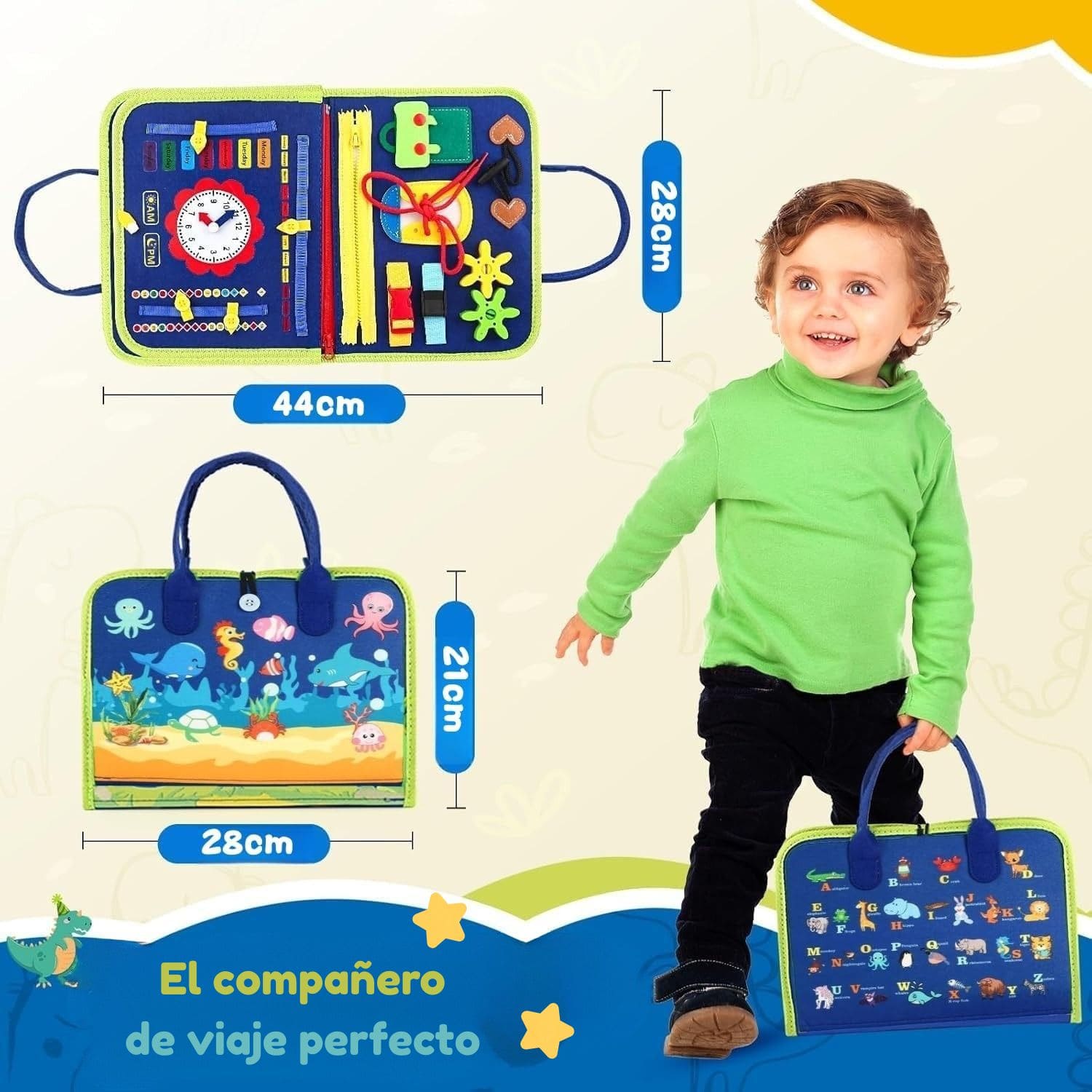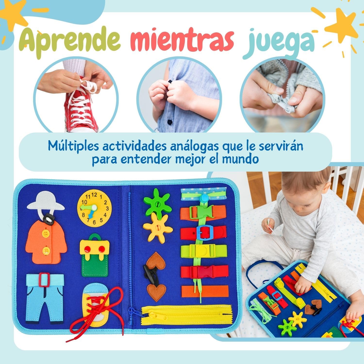Incluye múltiples actividades educativas tipo Montessori como cremalleras, botones, cordones, hebillas, rompecabezas, reloj, letras y calendario.